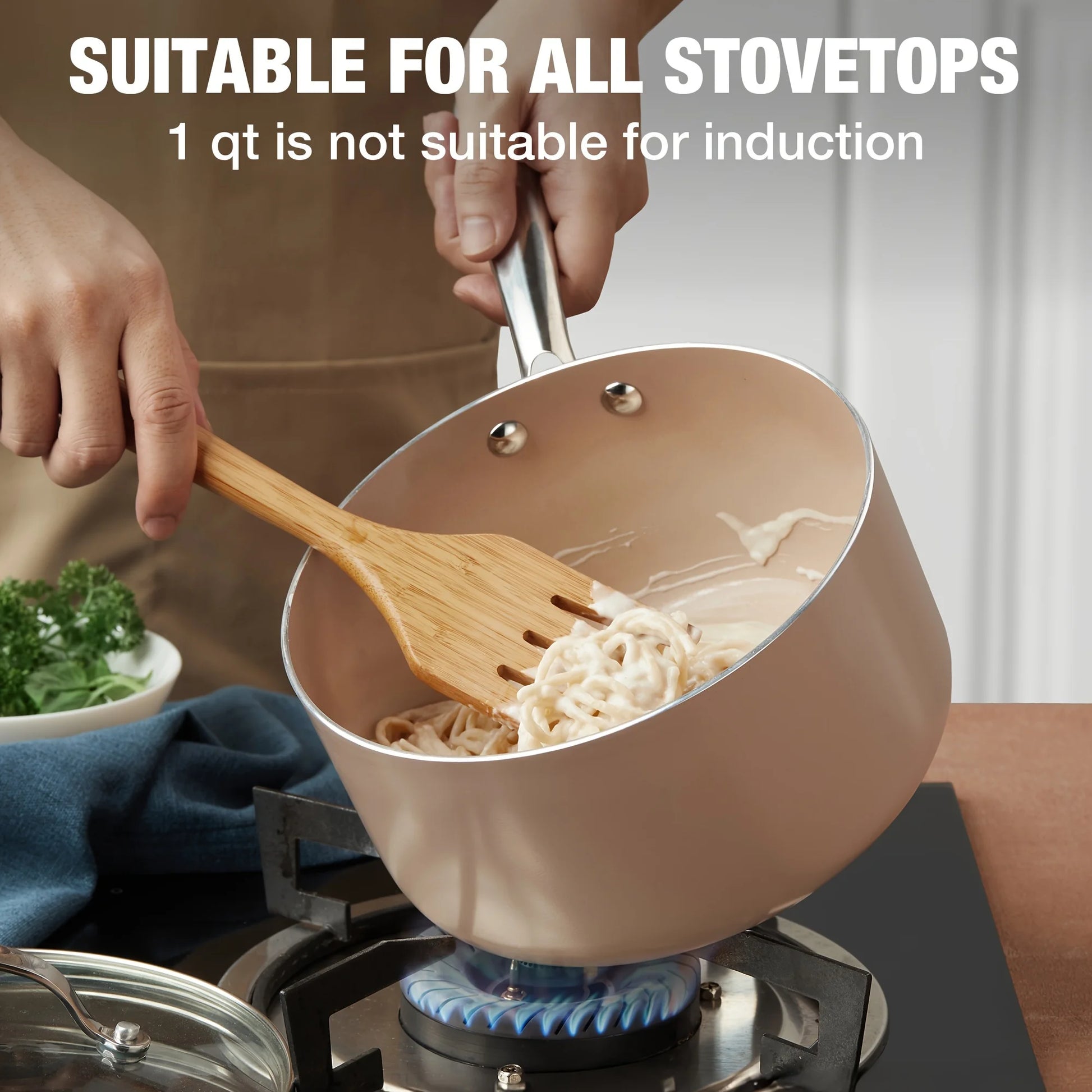 - Includes 1, 2, and 3 qt lidded saucepans; the set works on most cooktops for your convenience, with the 1 QT not induction-friendly, and it's oven-safe up to 420°F.
