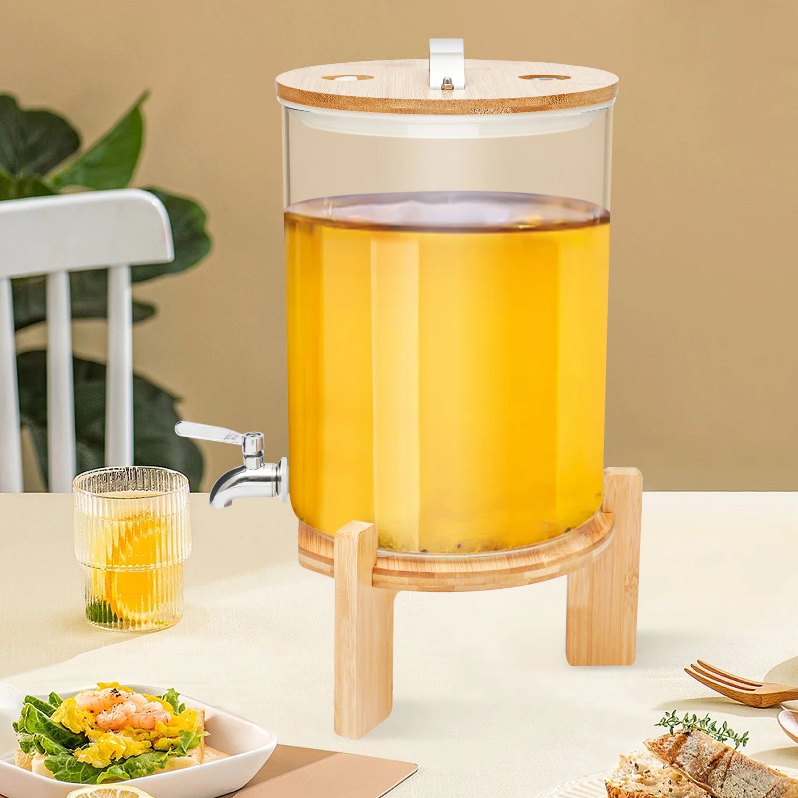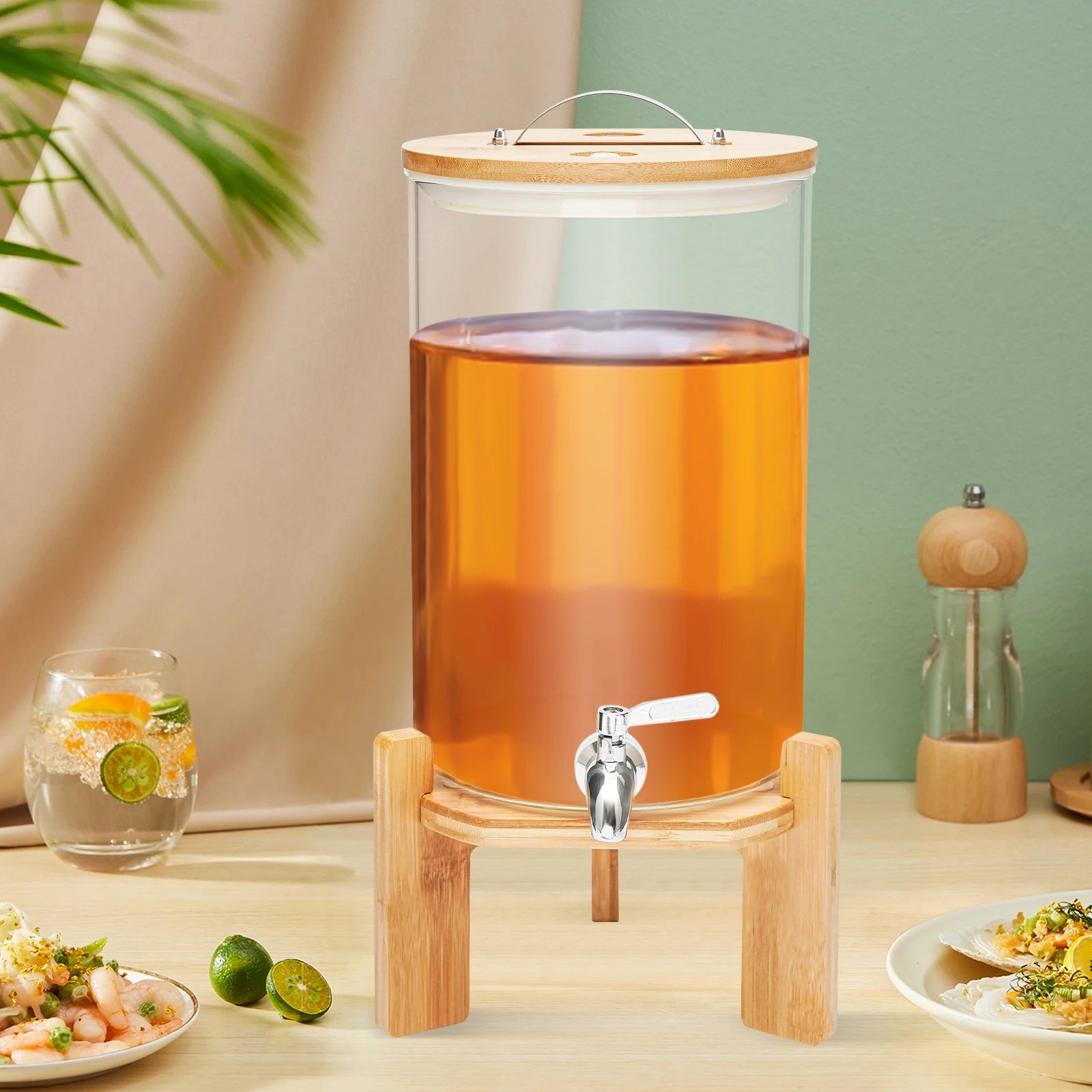 Simple Appearance: The combination of the round clear glass container and the original wood color frame and lid give this product a simple but eye-catching appearance that fits any room decor. It also displays your beverage naturally and beautifully.