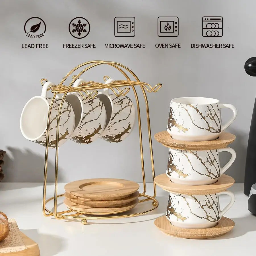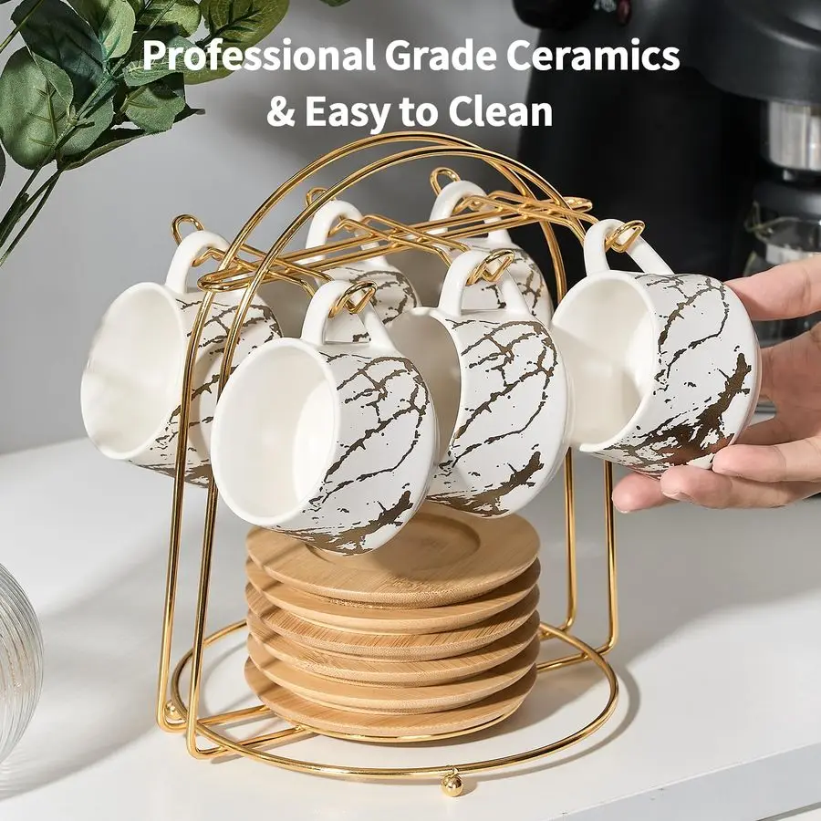 Ceramic Espresso Cups with Saucers and Metal Stand, Small 4 oz Porcelain Demitasse Cups Set of 6, Cute Cappuccino Coffee Cups fo