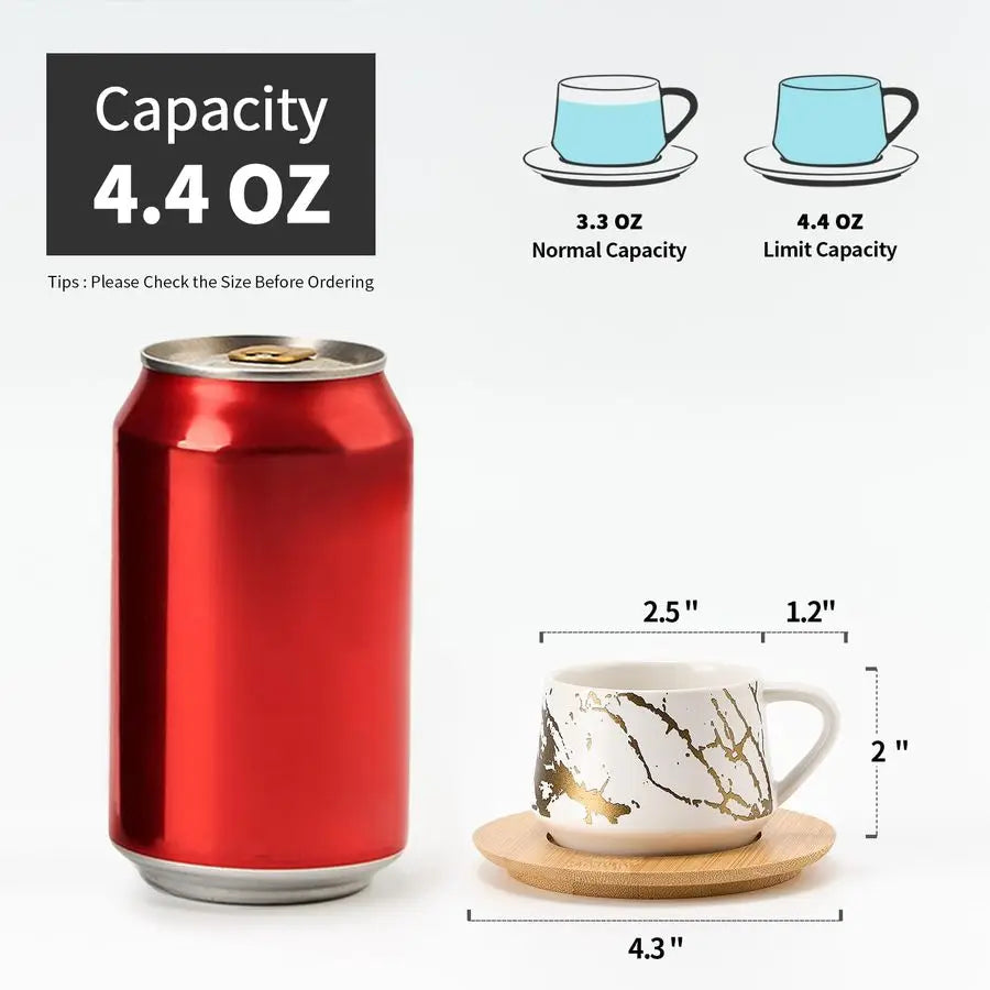 SAVE COUNTER SPACE Each Cup Dia2.5, H2. Capacityfull 4oz 130 ml. Each saucer Dia4.3 , H0.5 .The combination of the coffee cup set and the iron frame can prevent the cups and saucers from being randomly placed.They are the best collocation in your life.