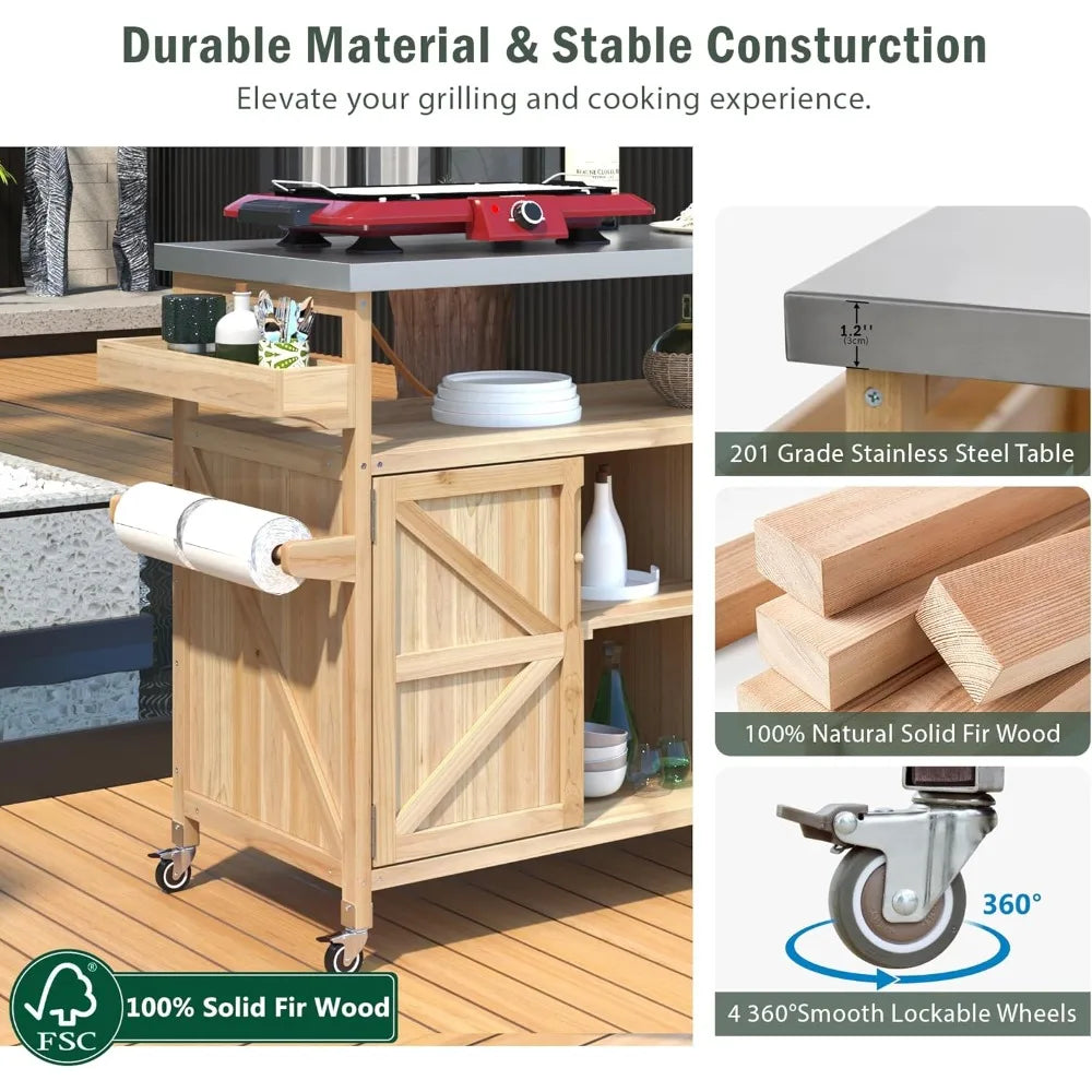 - Heavy Duty Structure: Crafted from 100% exquisite fir wood and featuring a 1.2-inch thick 201 stainless steel tabletop, this outdoor grill cart is both durable and easy to clean. Its natural charm and minimal chemical coatings ensure a skin-friendly and long-lasting product, perfect for any outdoor setting.